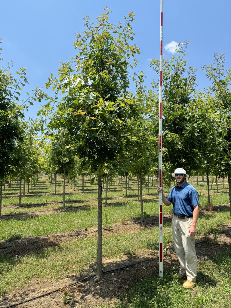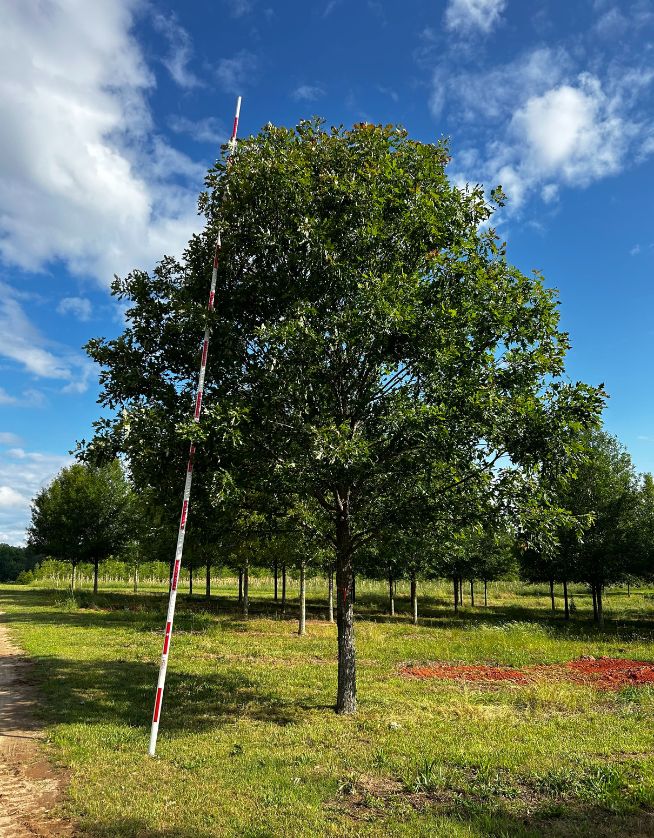Native shade tree – own root. The first cultivar Overcup Oak available on its own root. Dr. Michael Dirr declares, “Highbeam® Overcup Oak is a refinement of one of the best native species. Its uniqueness resides in the lustrous leathery leaves, changing yellow and bronze-red in fall. Further, leaf drop is clean and uniform, without the lingering dried brown foliage common to many oak species. The gray-brown winter branches and trunk assume a scaly texture, presenting a sculptural silhouette in the winter landscape. Branches are upswept, making Highbeam® a perfect street tree.”